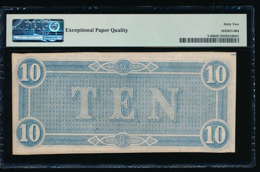 One 1864 $10 T-68 Confederate PMG 62EPQ.