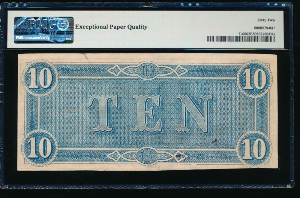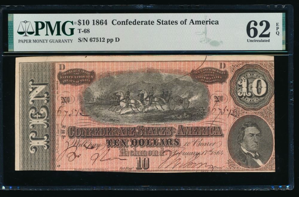 One 1864 $10 T-68 Confederate PMG 62EPQ.