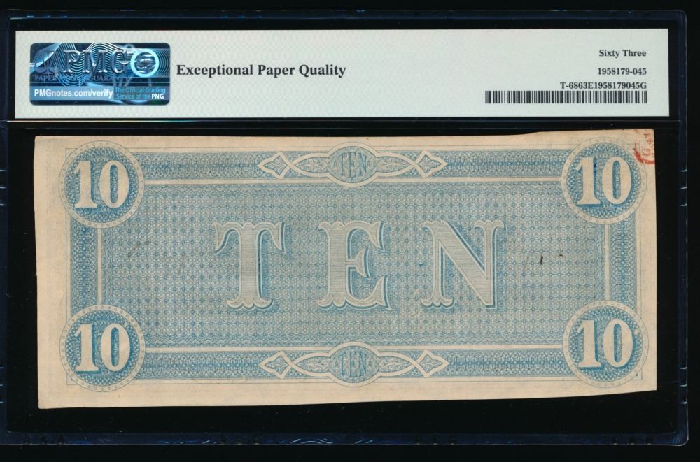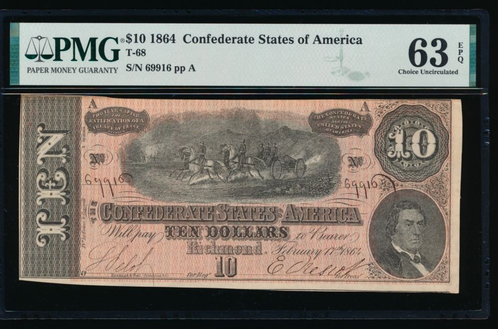 One 1864 $10 T-68 Confederate PMG 63EPQ.