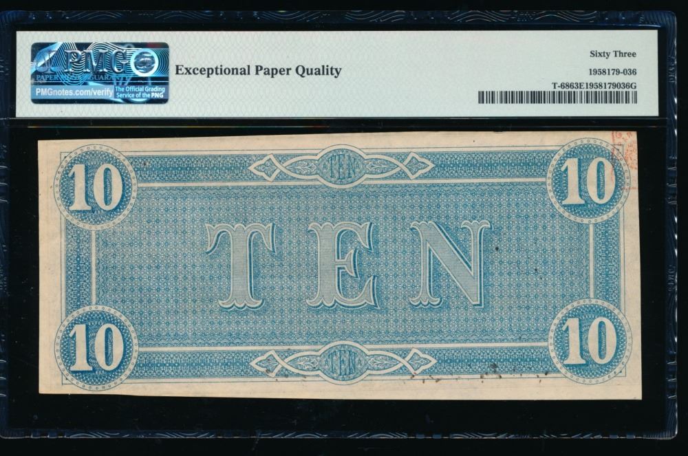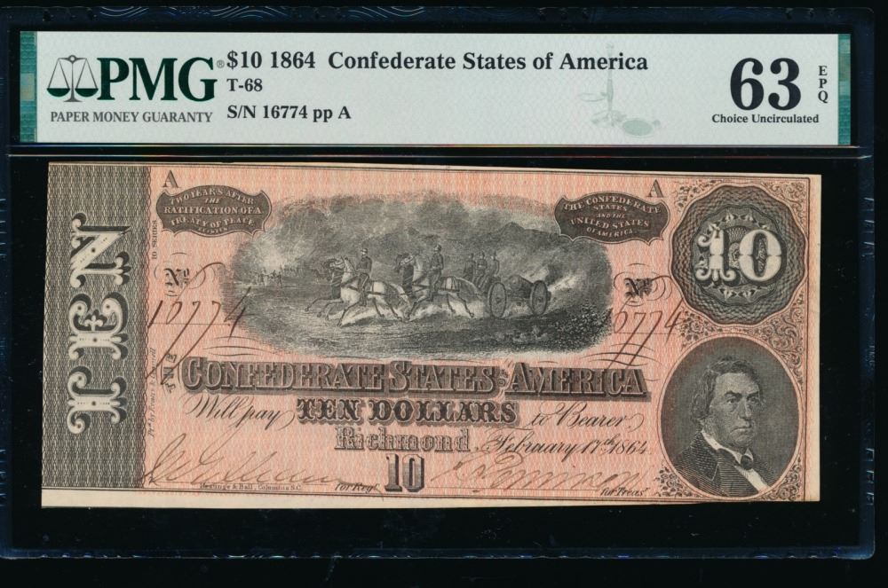 One 1864 $10 T-68 Confederate PMG 63EPQ.