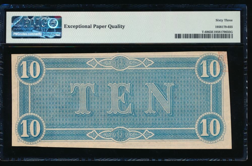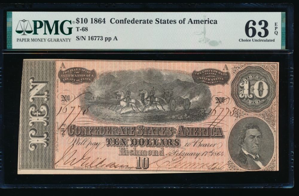 One 1864 $10 T-68 Confederate PMG 63EPQ.