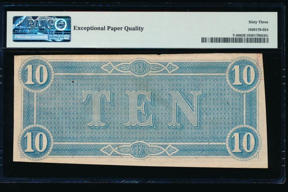 One 1864 $10 T-68 Confederate PMG 63EPQ.