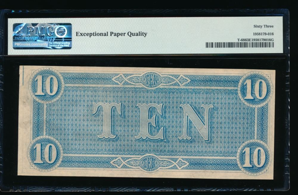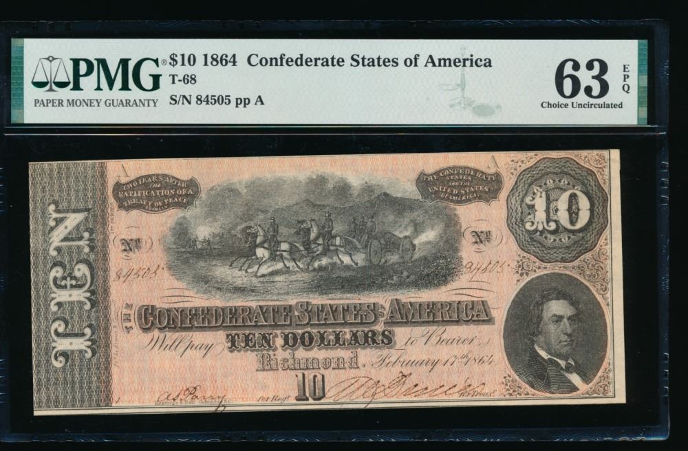One 1864 $10 T-68 Confederate PMG 63EPQ.