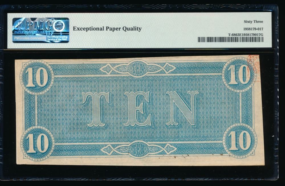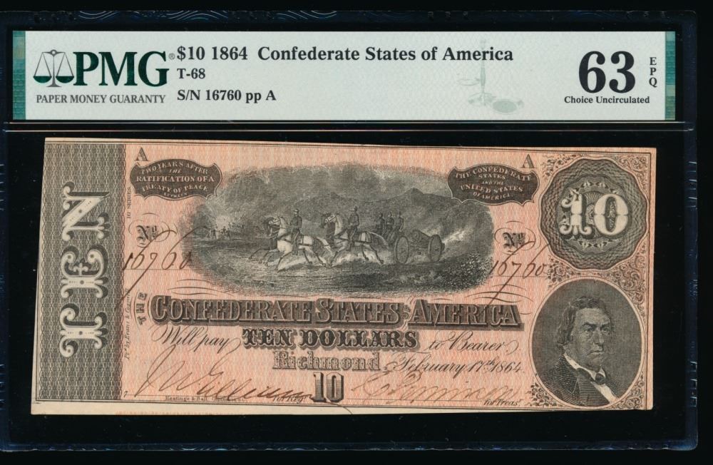 One 1864 $10 T-68 Confederate PMG 63EPQ.