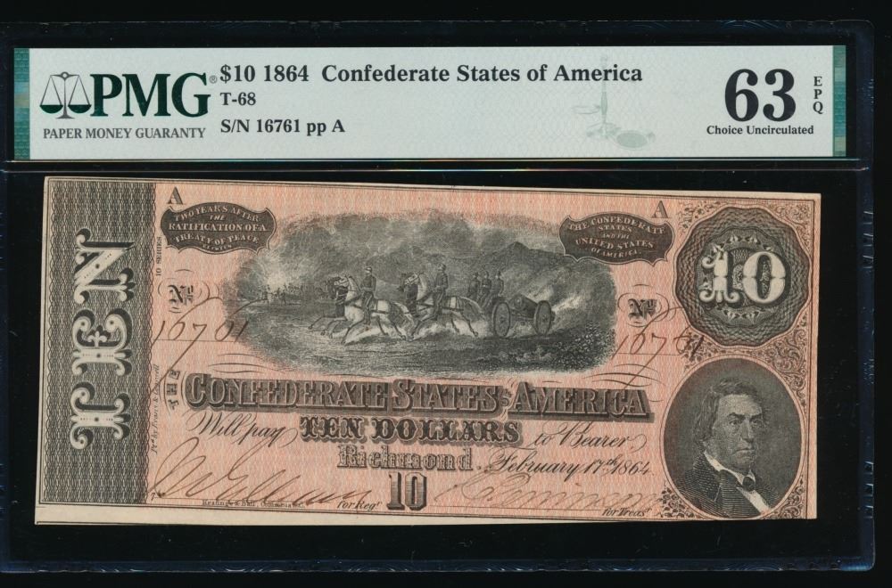 One 1864 $10 T-68 Confederate PMG 63EPQ.