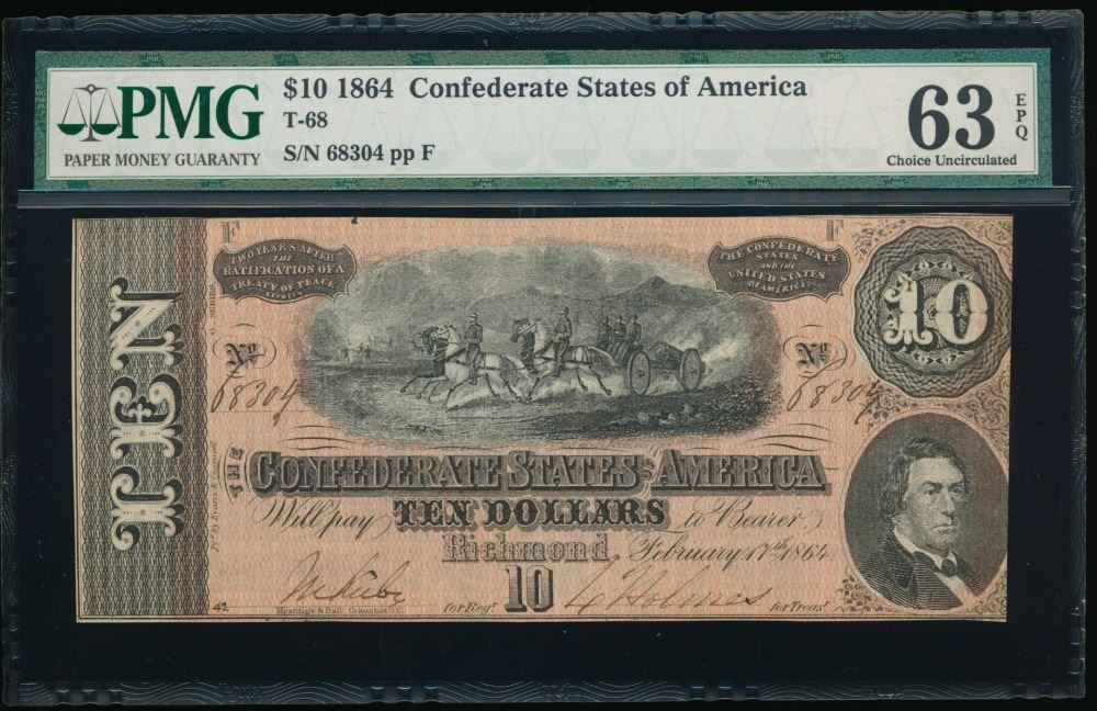 One 1864 $10 T-68 Confederate PMG 63EPQ.