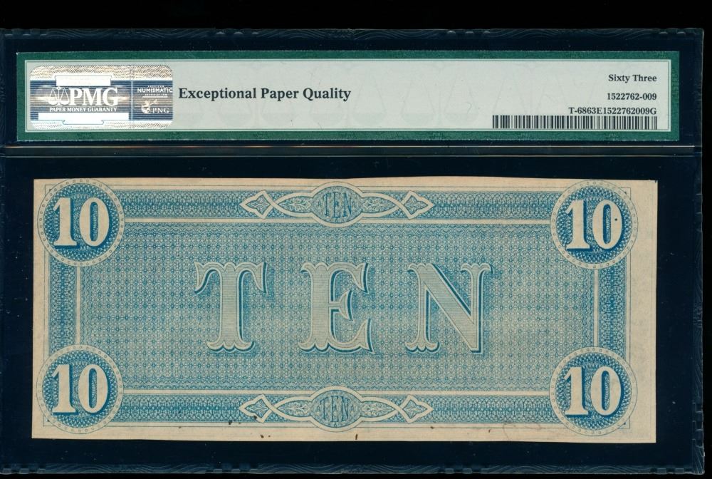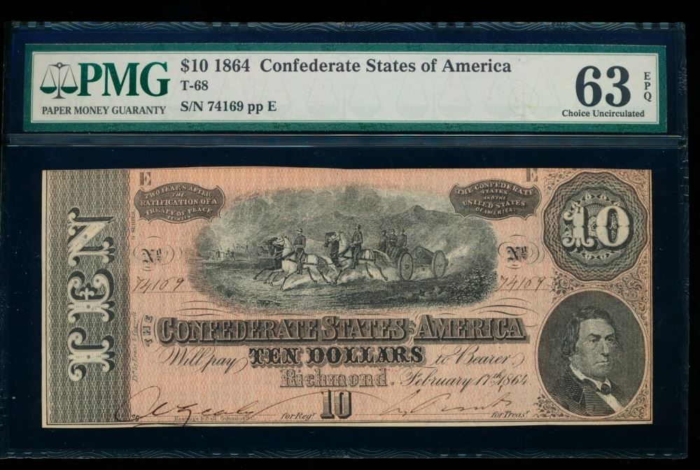 One 1864 $10 T-68 Confederate PMG 63EPQ.