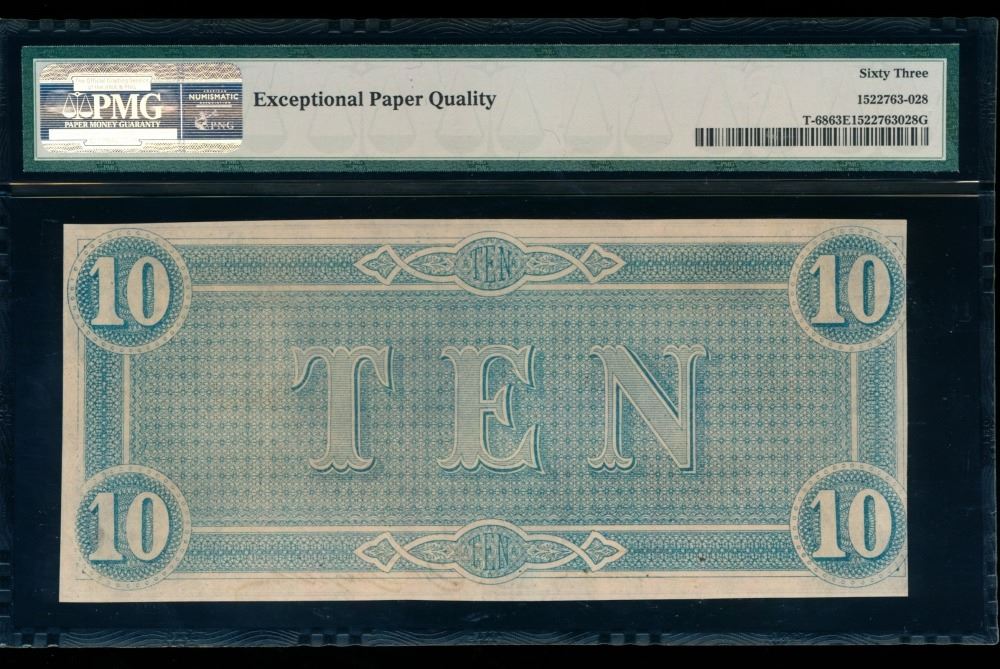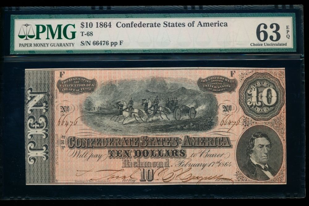 One 1864 $10 T-68 Confederate PMG 63EPQ.