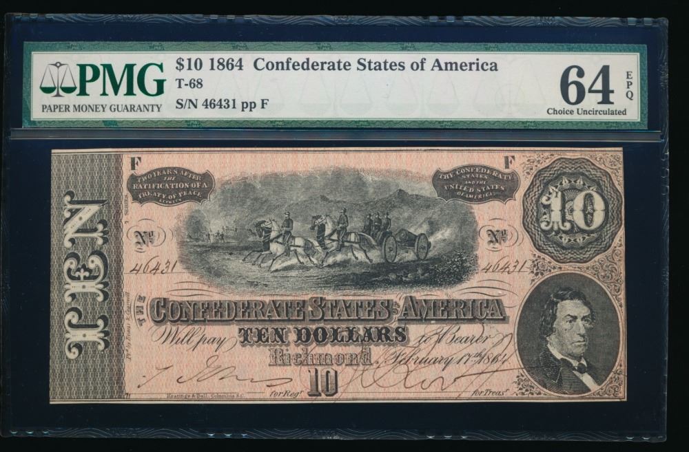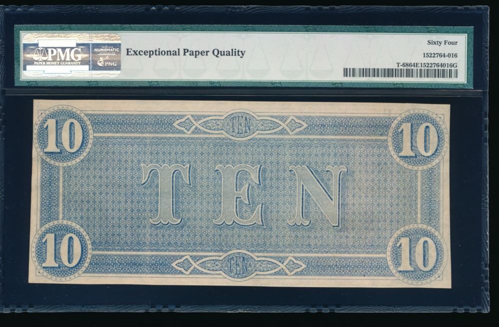 One 1864 $10 T-68 Confederate PMG 64EPQ.