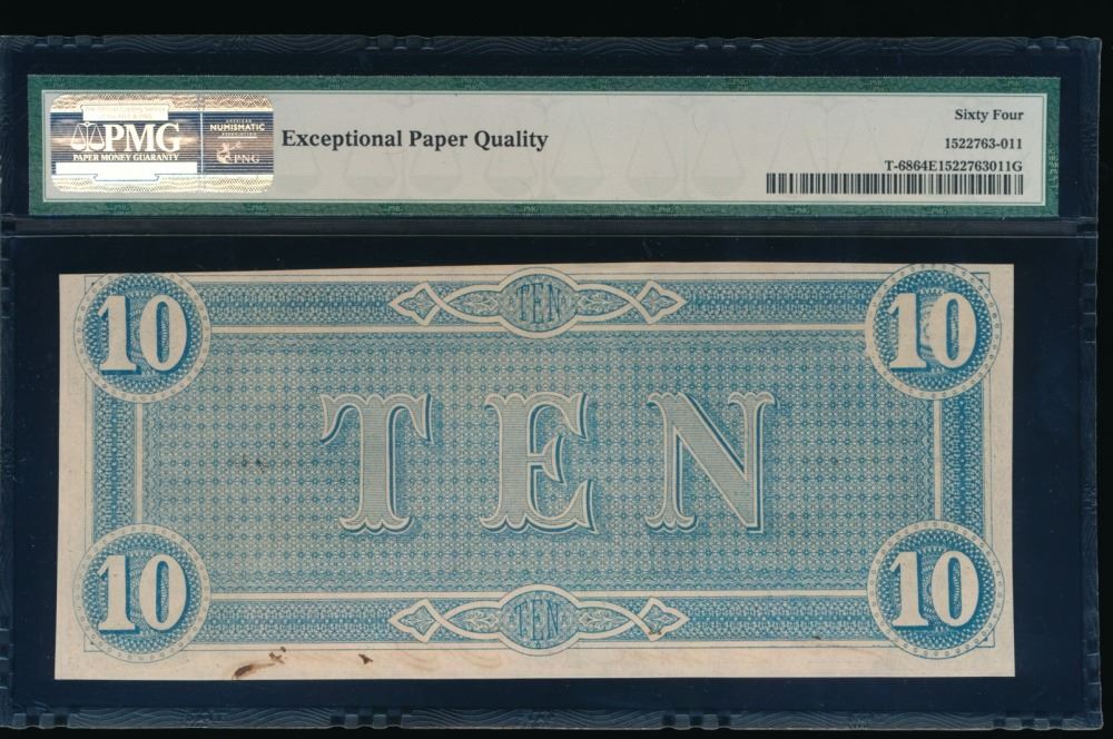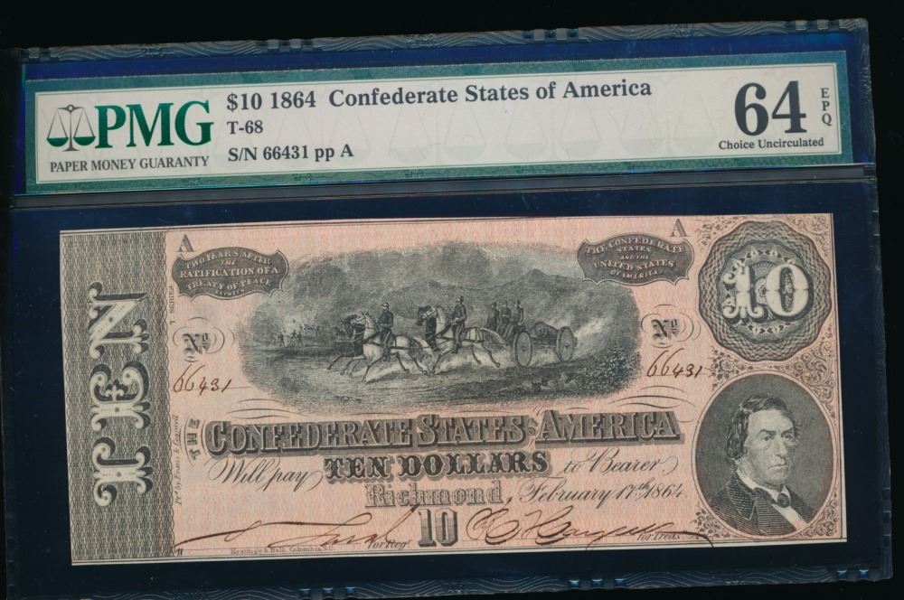 One 1864 $10 T-68 Confederate PMG 64EPQ.