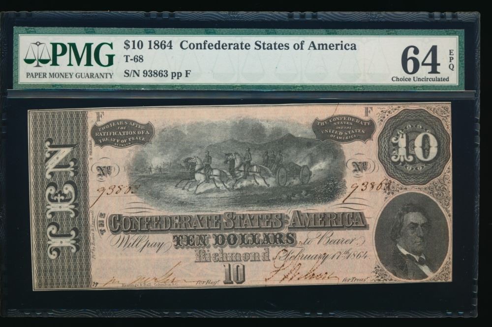 One 1864 $10 T-68 Confederate PMG 64EPQ.