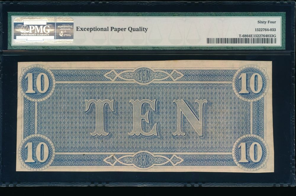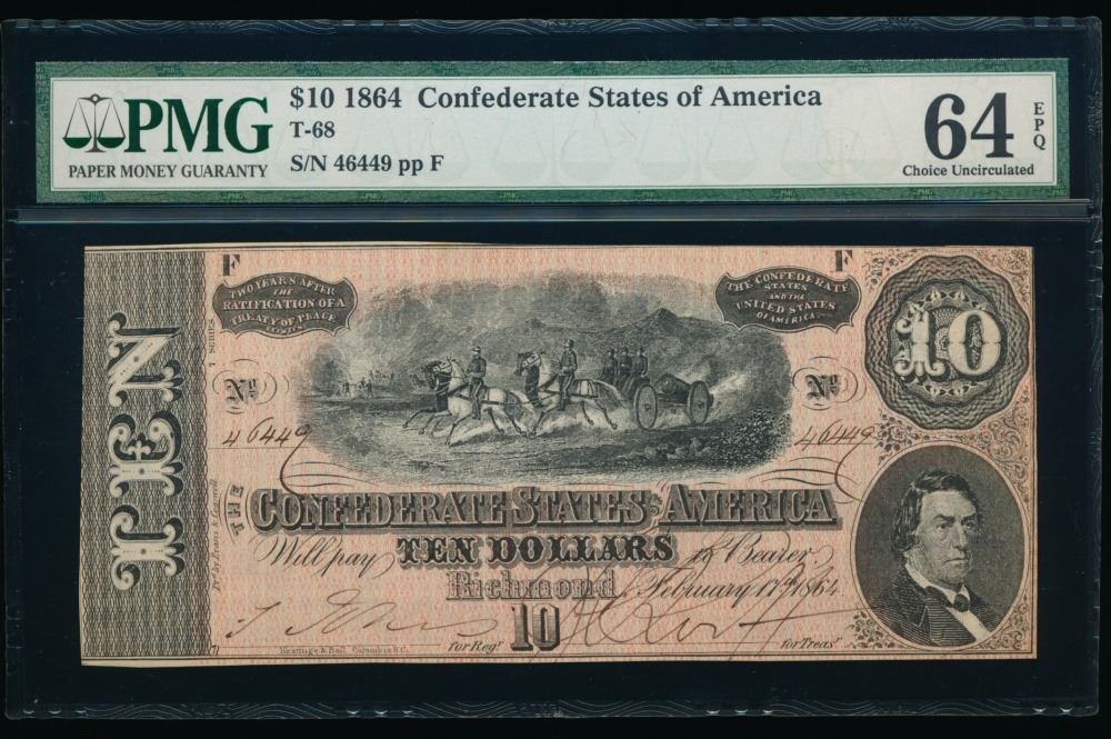 One 1864 $10 T-68 Confederate PMG 64EPQ.