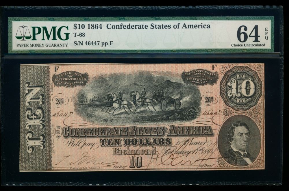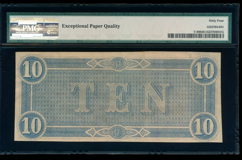 One 1864 $10 T-68 Confederate PMG 64EPQ.