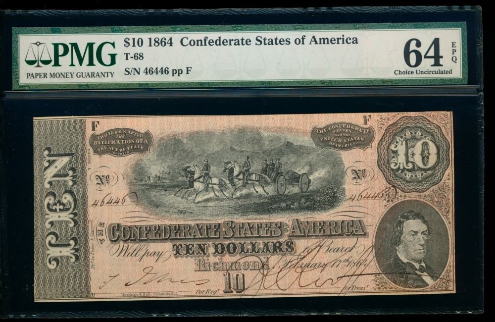 One 1864 $10 T-68 Confederate PMG 64EPQ.