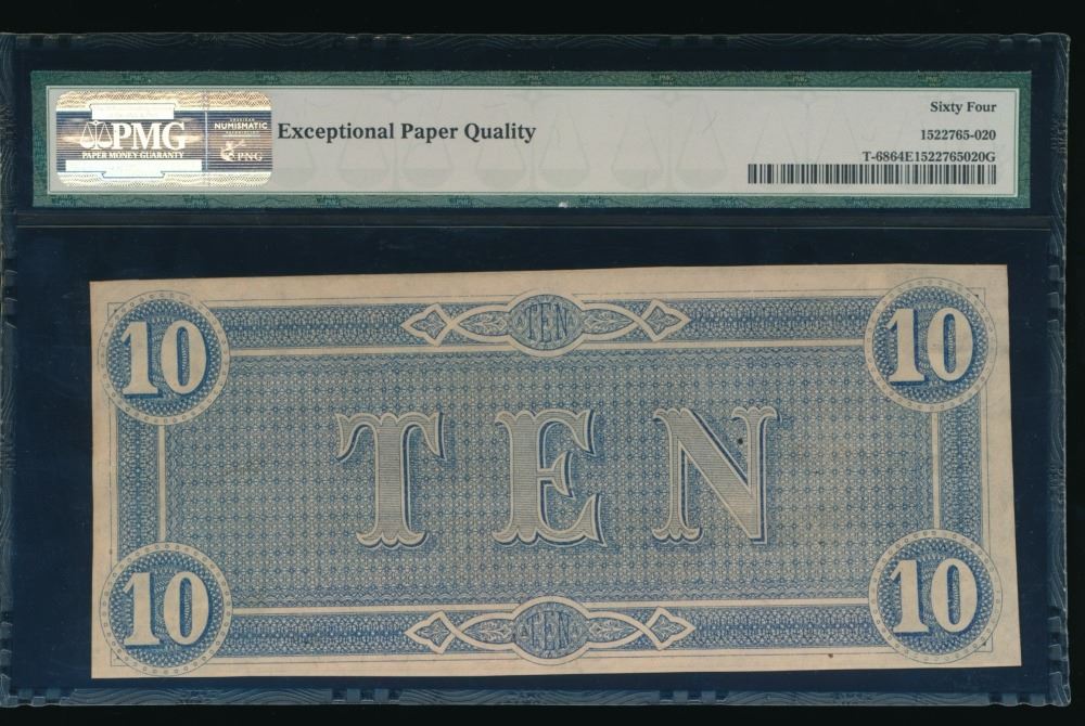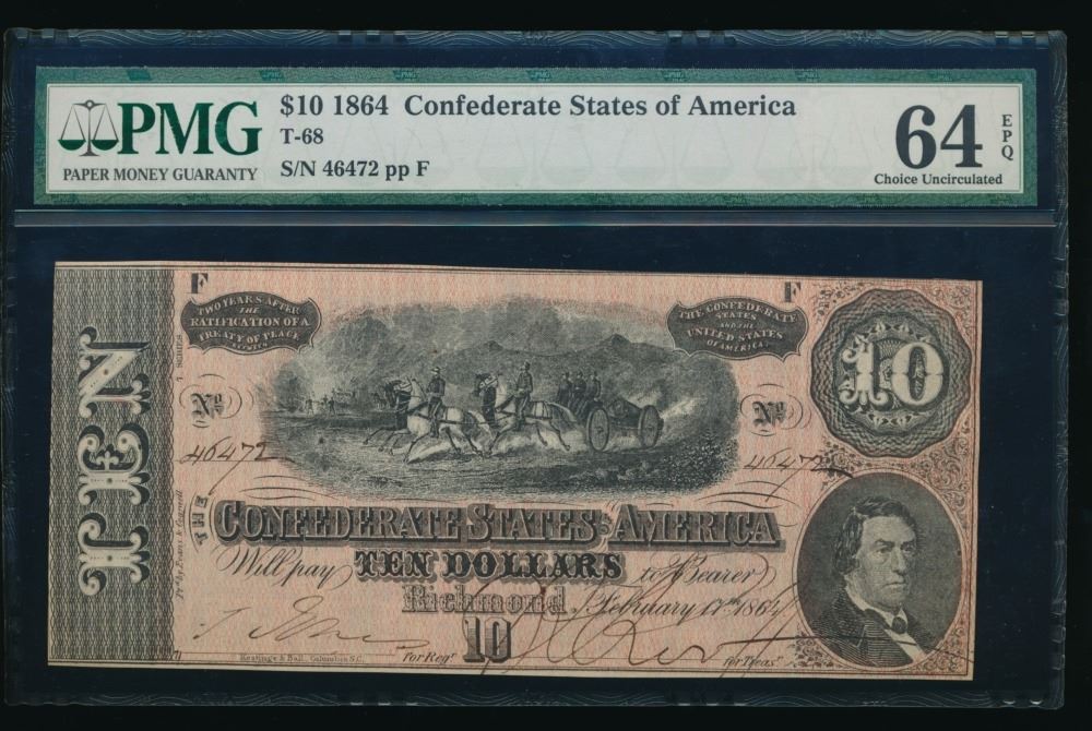 One 1864 $10 T-68 Confederate PMG 64EPQ.