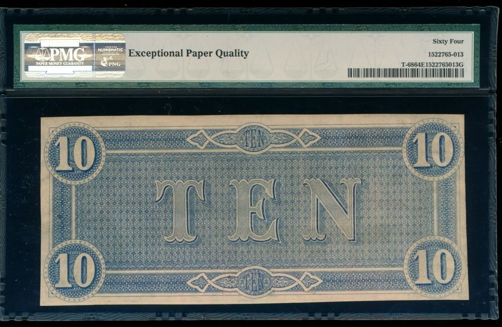 One 1864 $10 T-68 Confederate PMG 64EPQ.