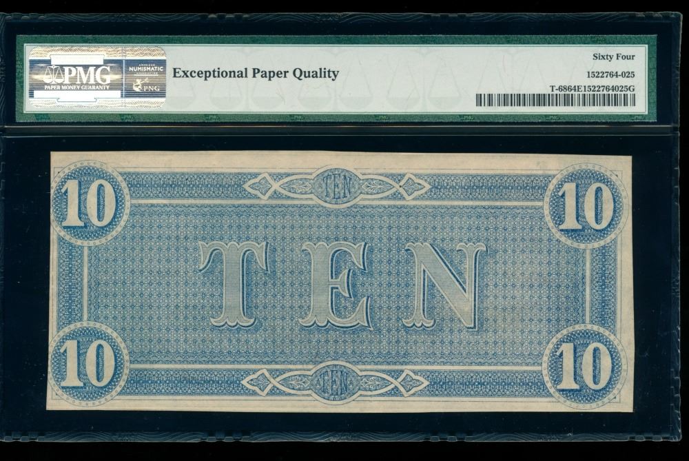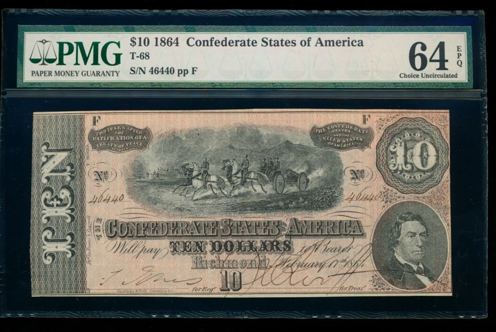 One 1864 $10 T-68 Confederate PMG 64EPQ.