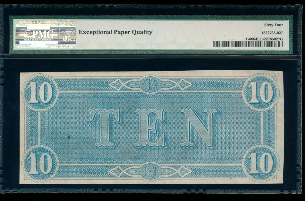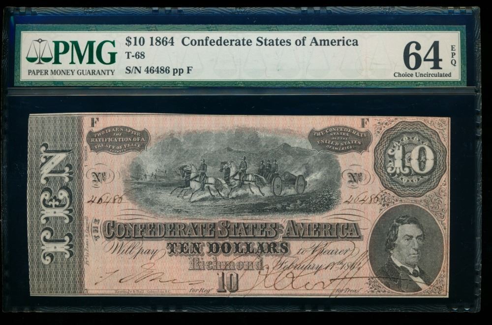 One 1864 $10 T-68 Confederate PMG 64EPQ.