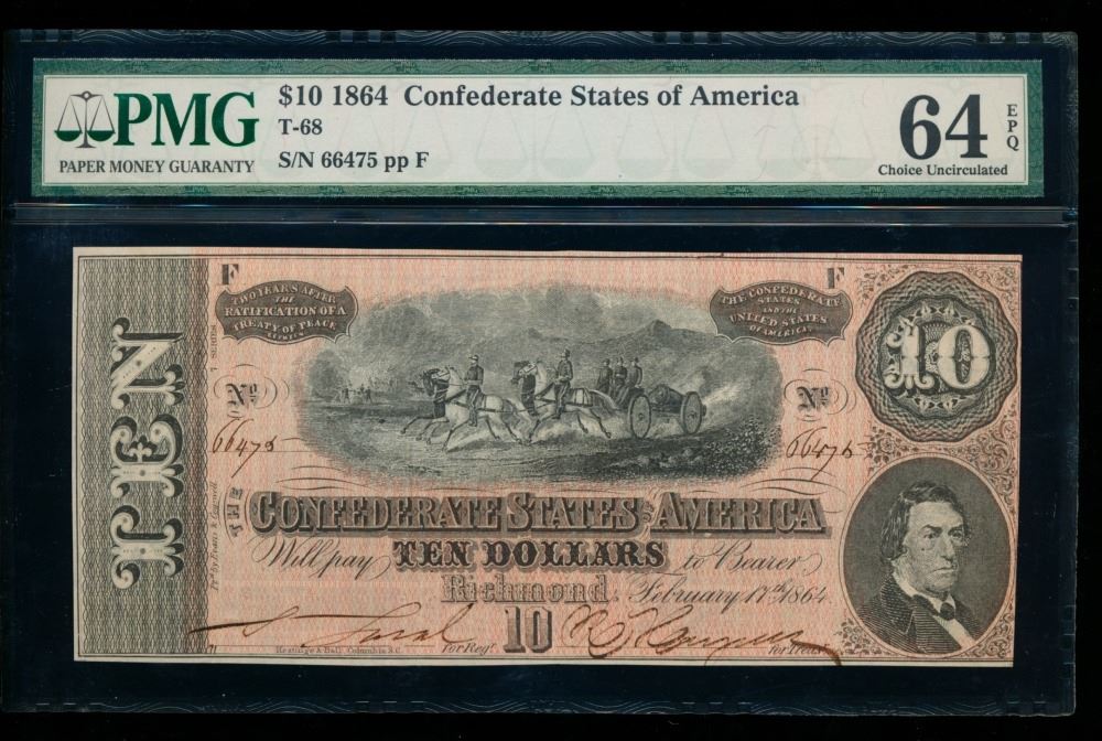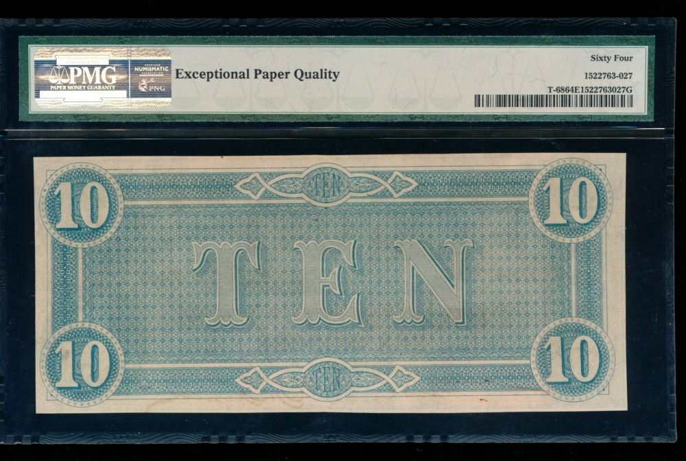 One 1864 $10 T-68 Confederate PMG 64EPQ.