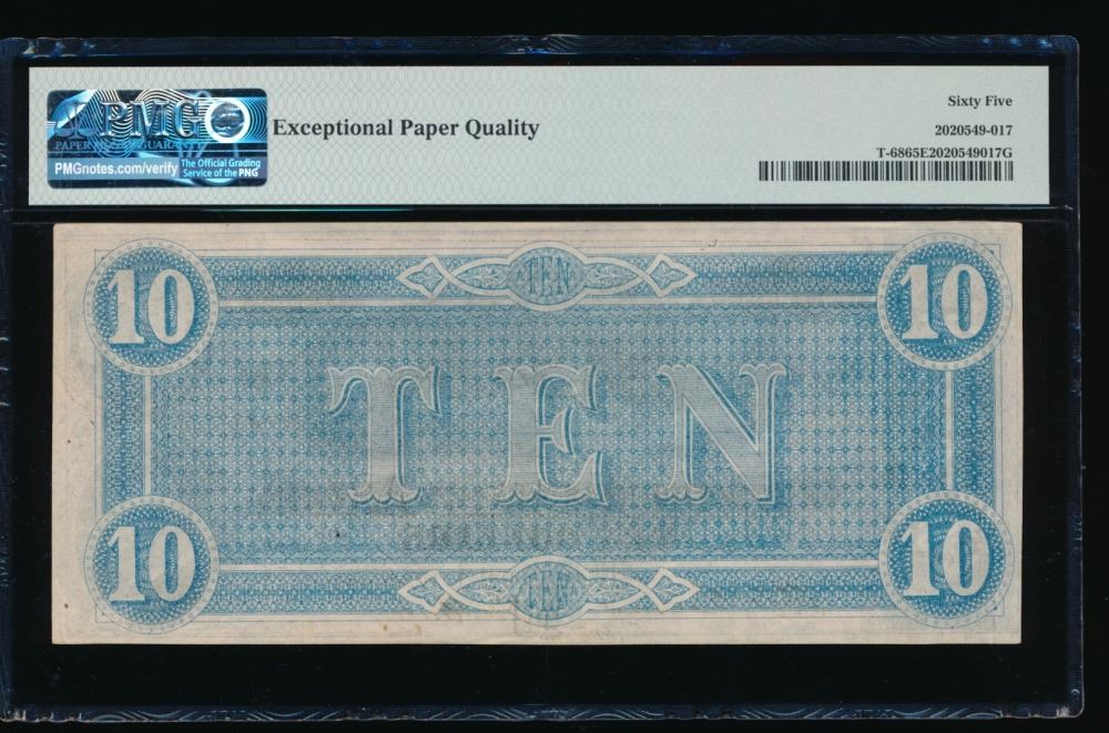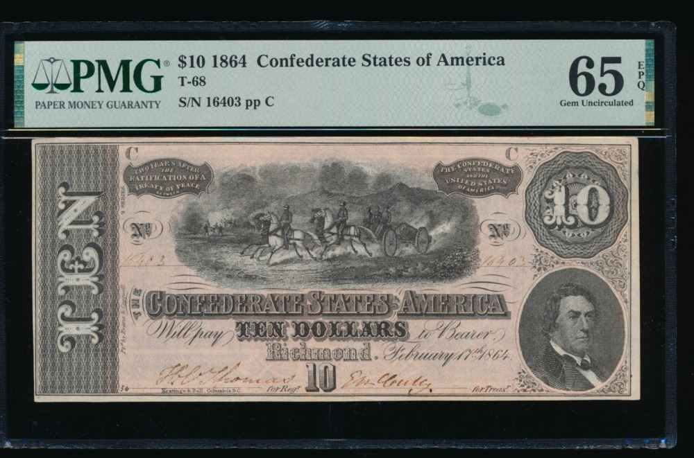 One 1864 $10 T-68 Confederate PMG 65EPQ.