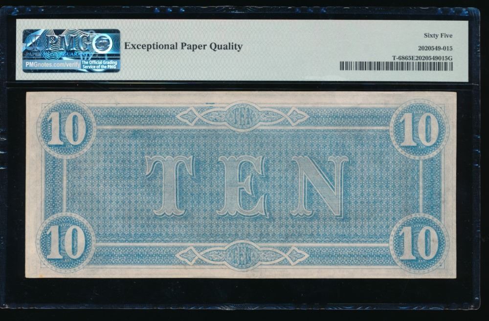 One 1864 $10 T-68 Confederate PMG 65EPQ.