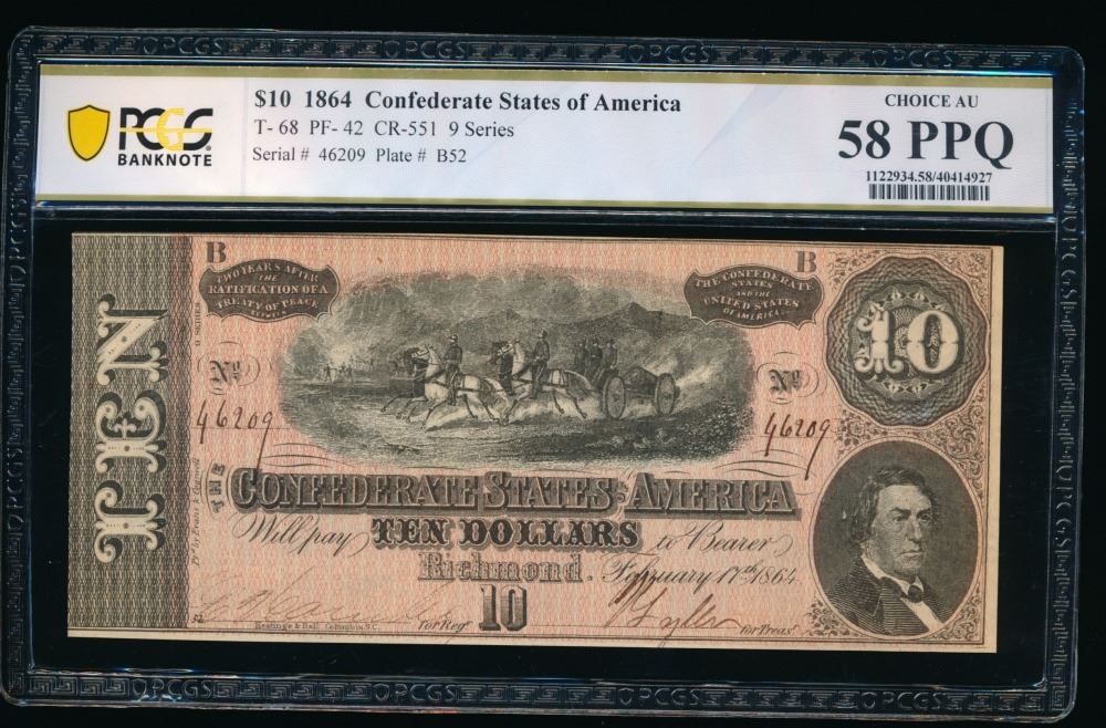 One 1864 $10 T-68 Confederate States of America PCGS 58PPQ.