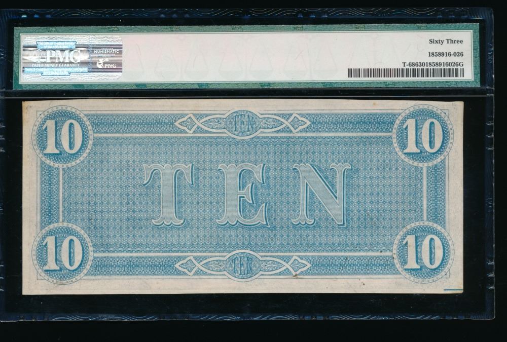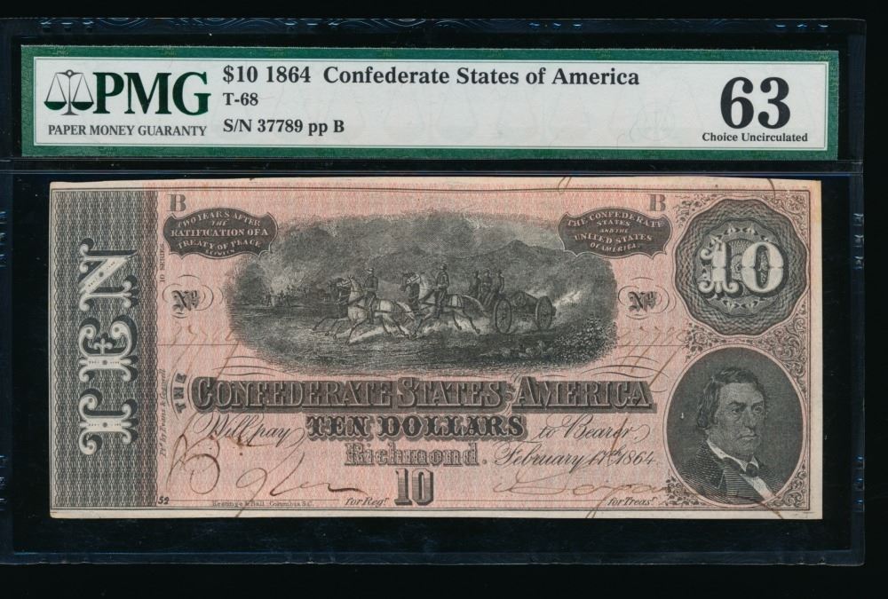 One 1864 $10 T-68 Confederate States of America PMG 63.