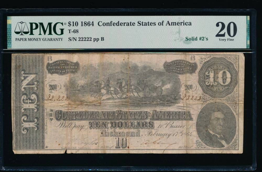 One 1864 $10 T-68 Solid 2's Confederate PMG 20.