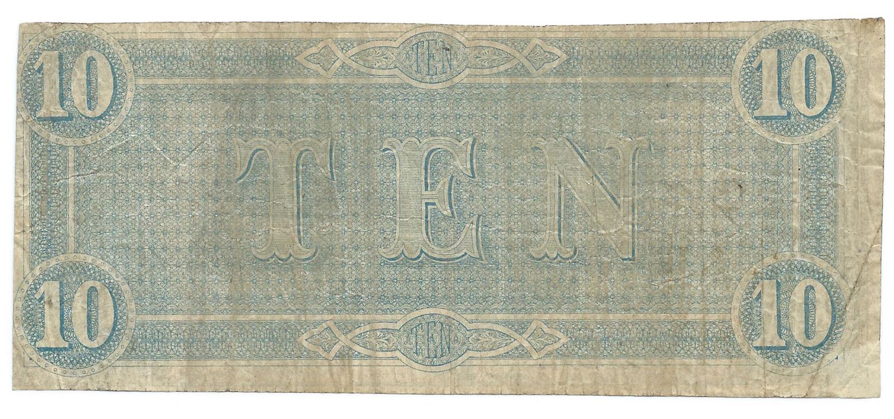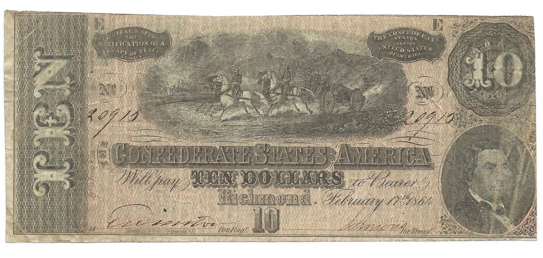 One 1864 $10 The Confederate States of America Note T-68 CC