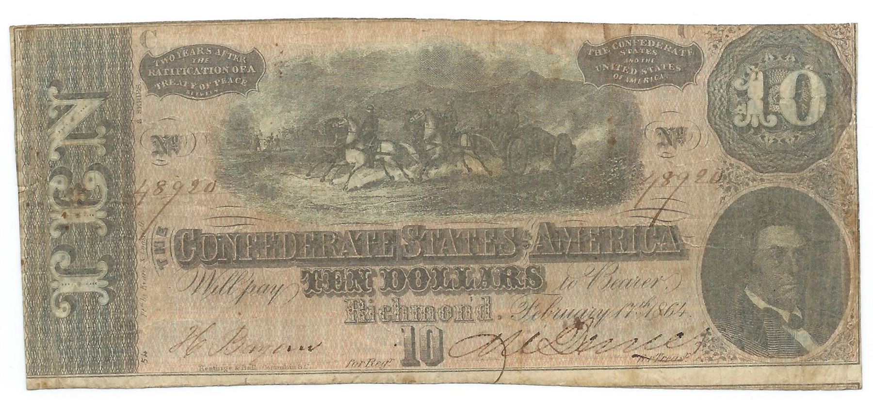 One 1864 $10 The Confederate States of America Note T-68 CC
