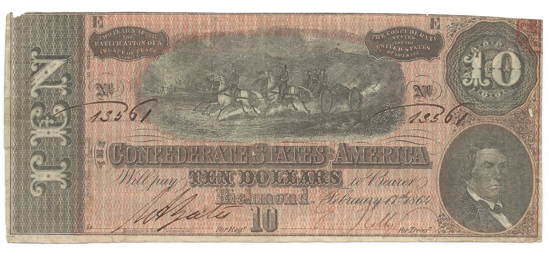 One 1864 $10 The Confederate States of America Note T-68 CC