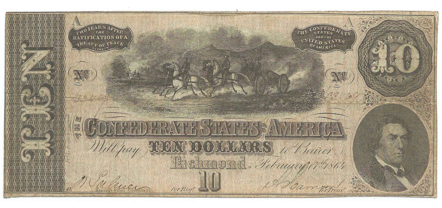 One 1864 $10 The Confederate States of America Note T-68 CC