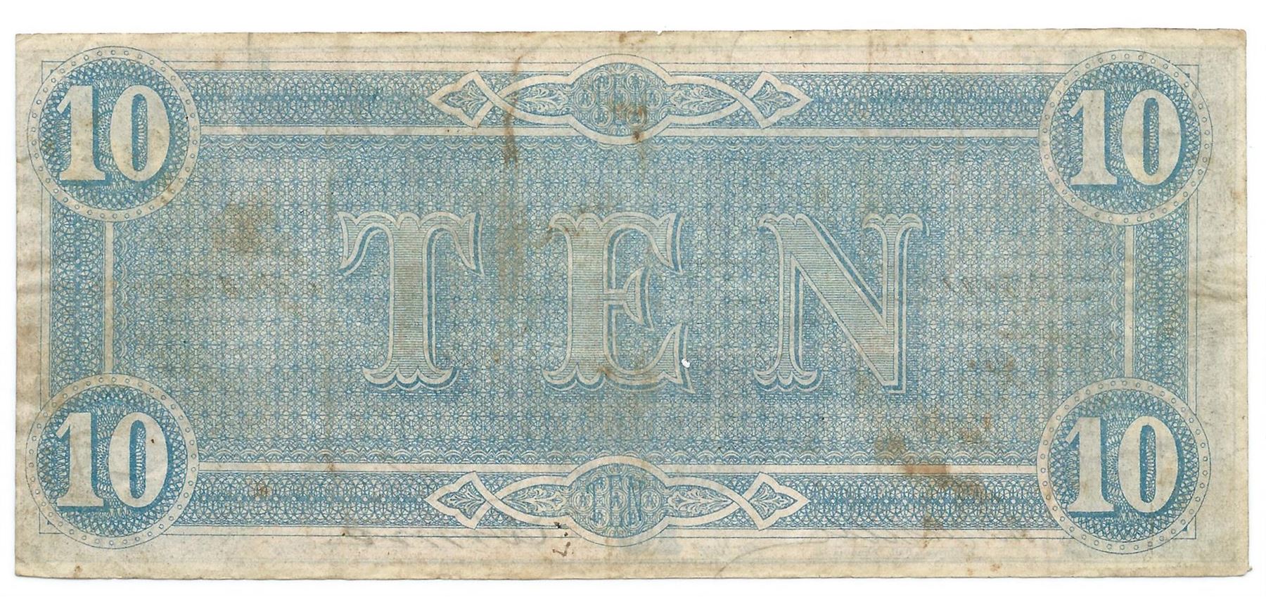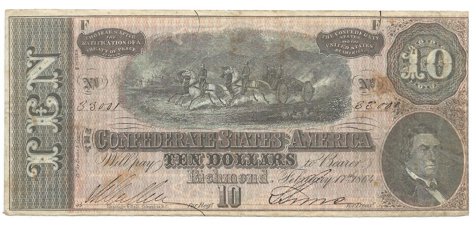One 1864 $10 The Confederate States of America Note T-68 CC