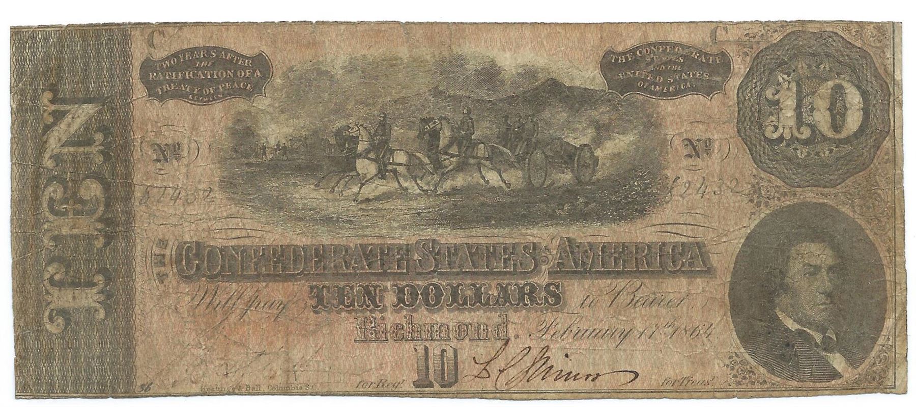 One 1864 $10 The Confederate States of America Note T-68 CC