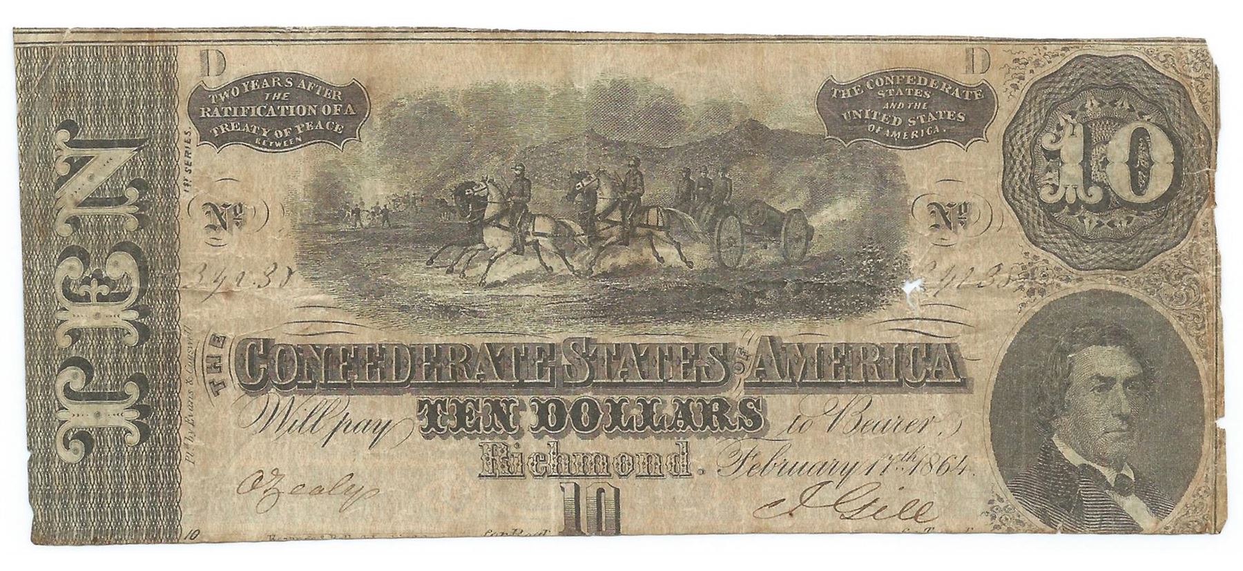 One 1864 $10 The Confederate States of America Note T-68 CC