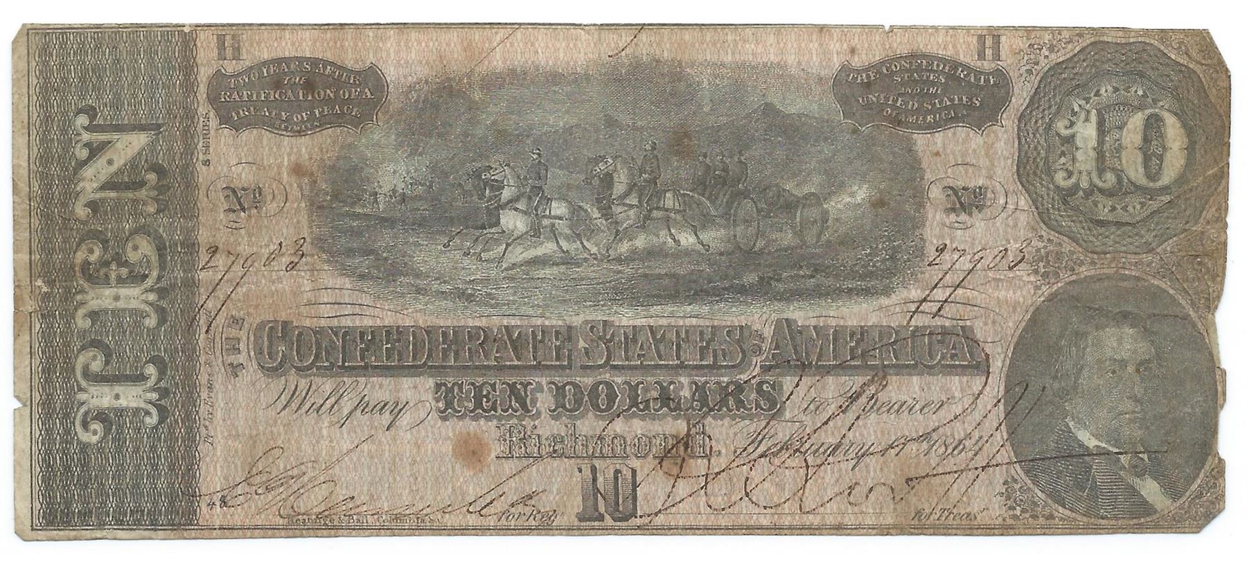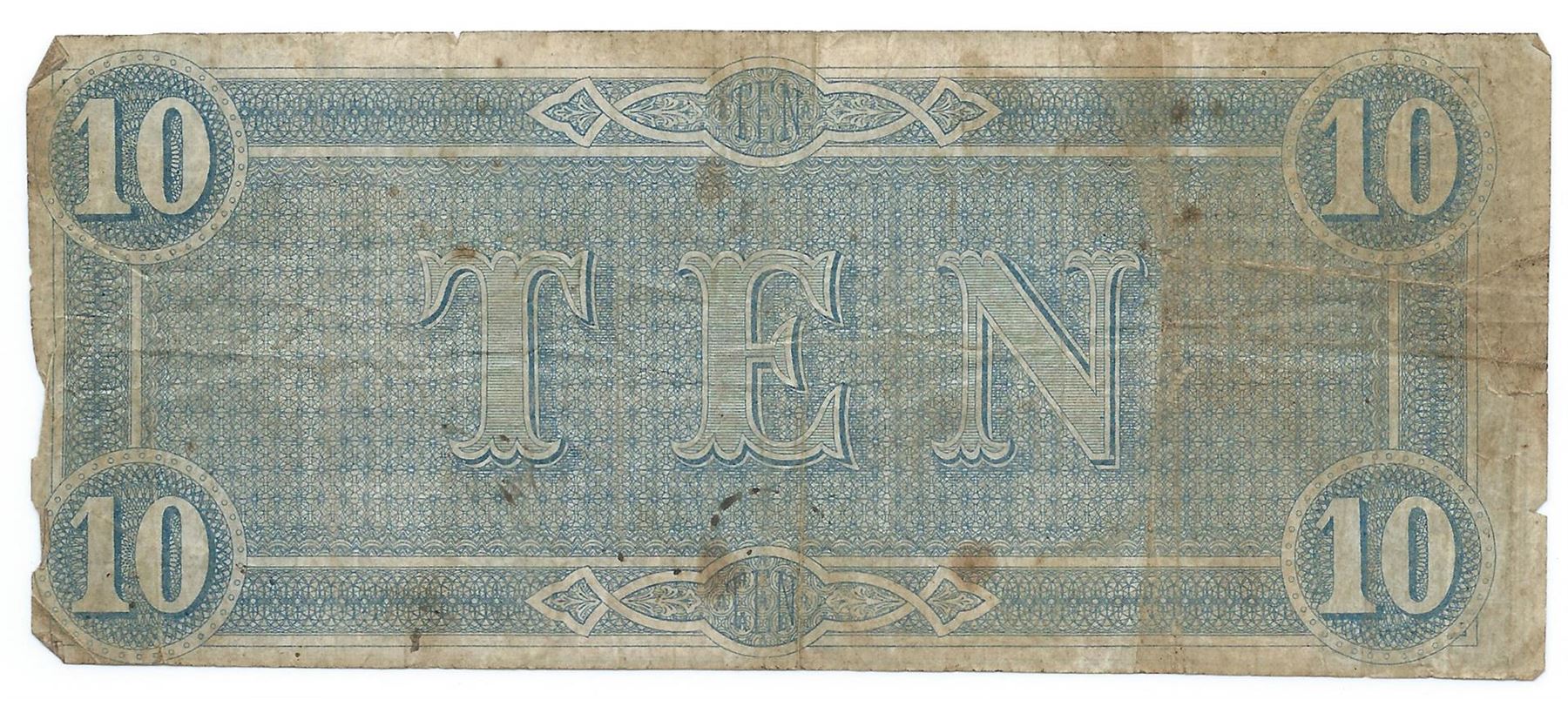 One 1864 $10 The Confederate States of America Note T-68 CC