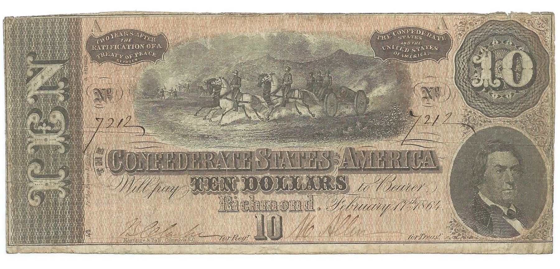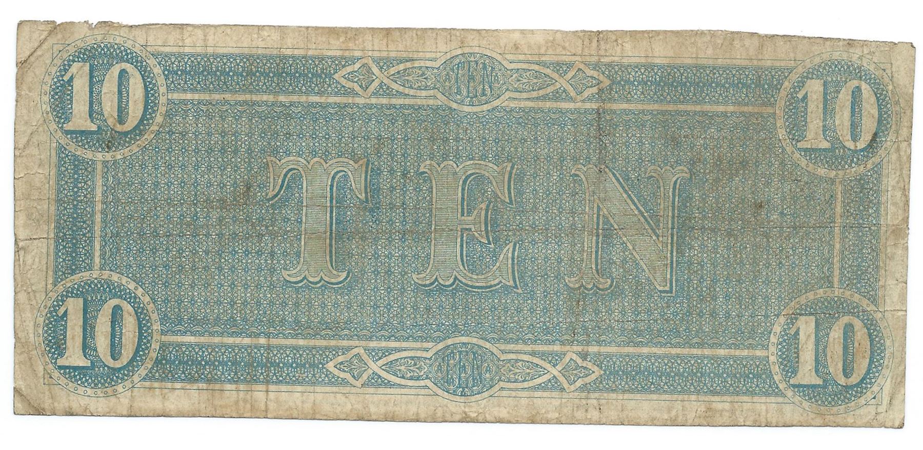 One 1864 $10 The Confederate States of America Note T-68 CC