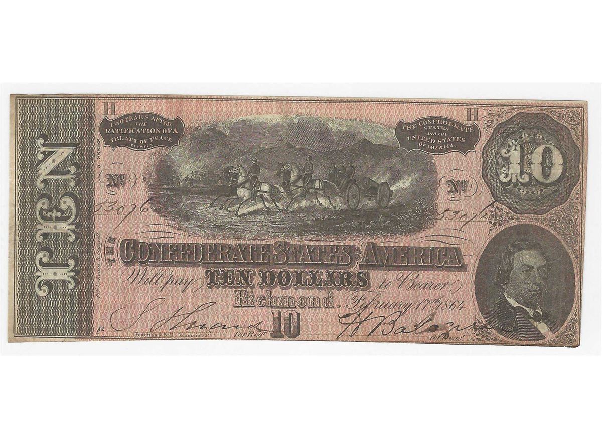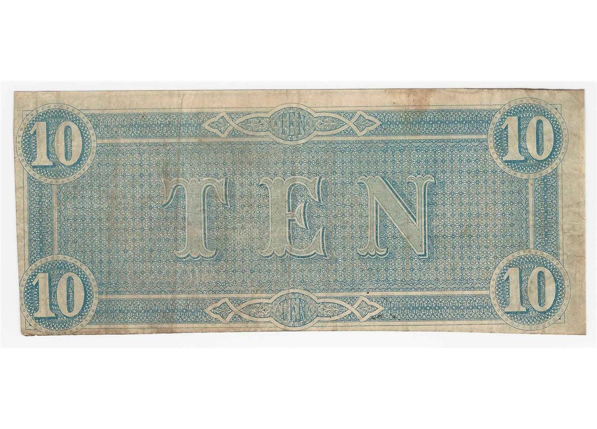 One 1864 $10 The Confederate States of America Note.