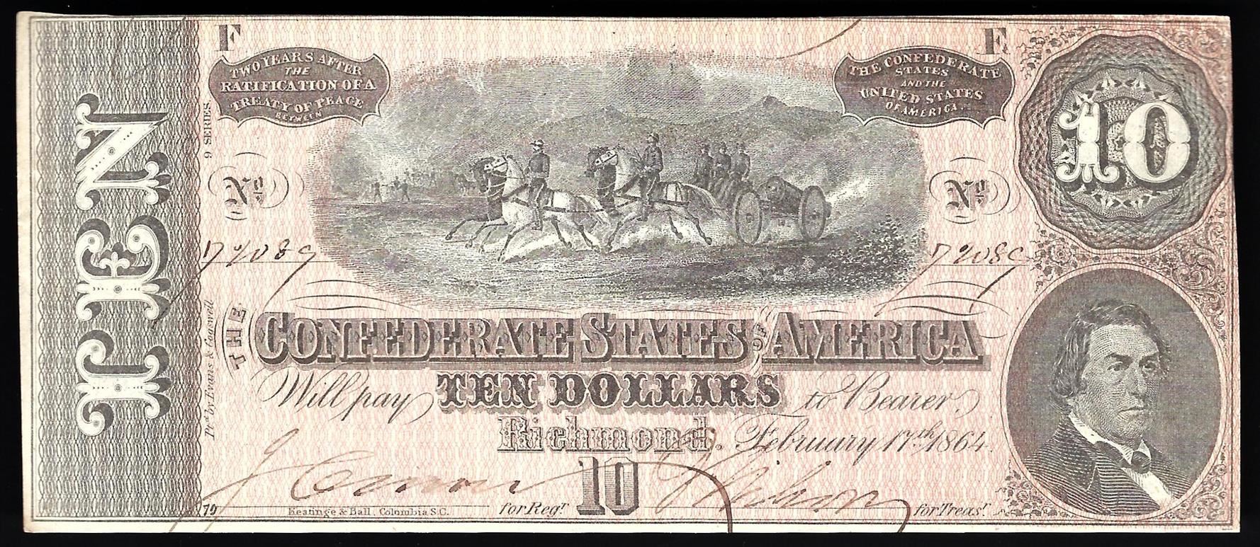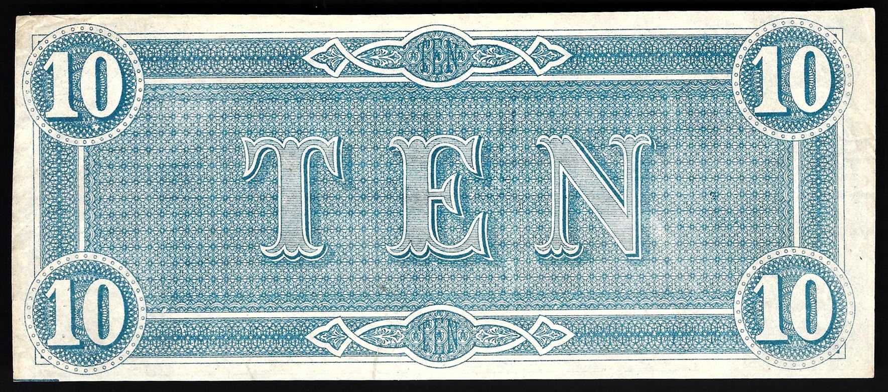 One 1864 $10 The Confederate States of America Note.