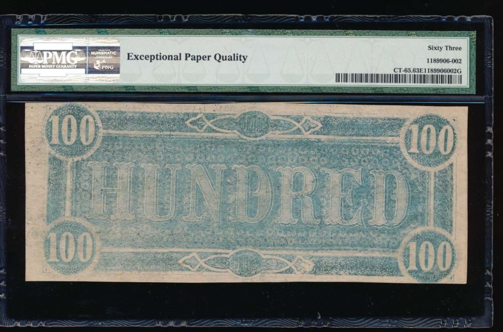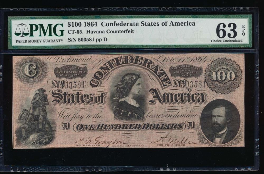 One 1864 $100 Confederate States Havana Counterfeit Note PMG 63EPQ.