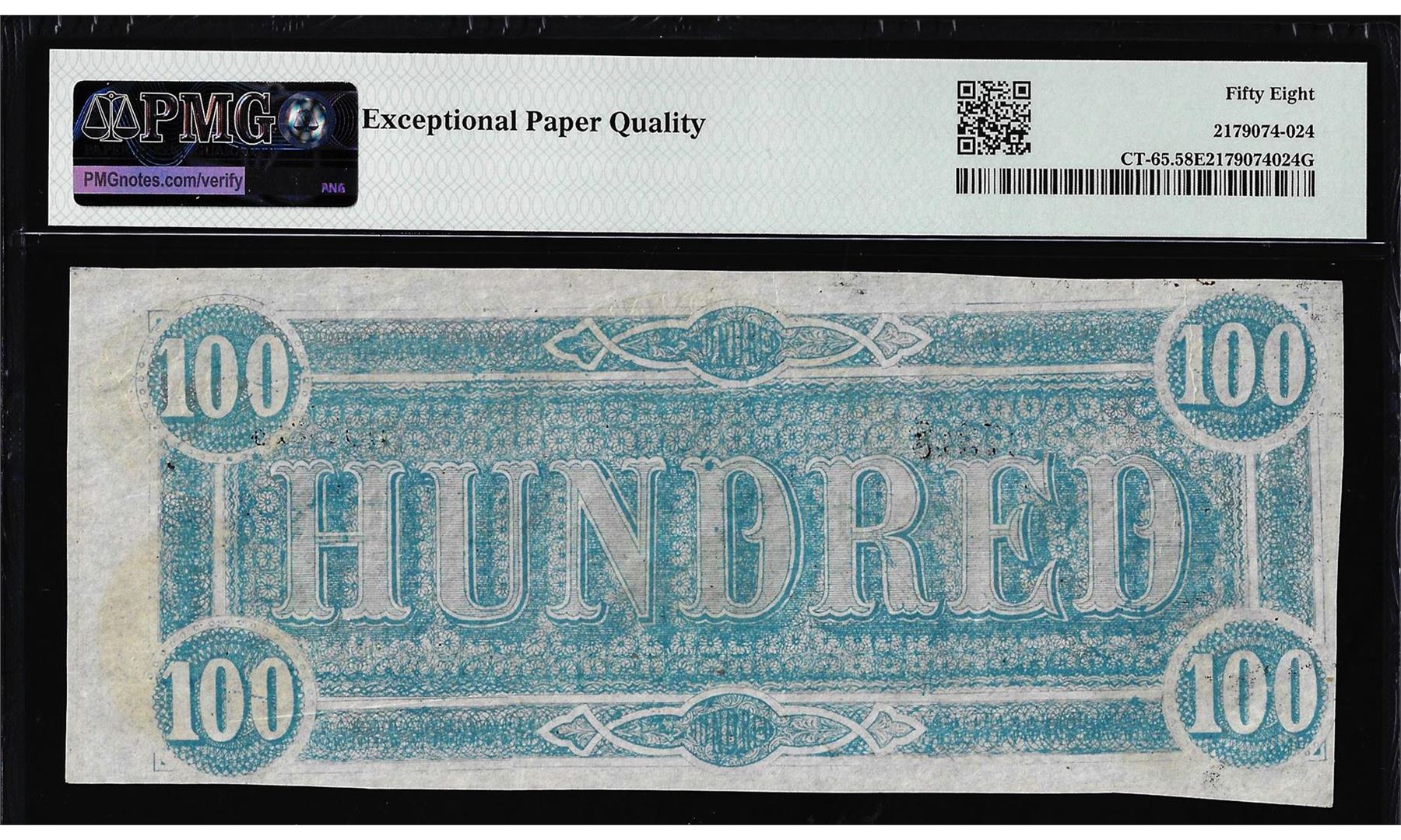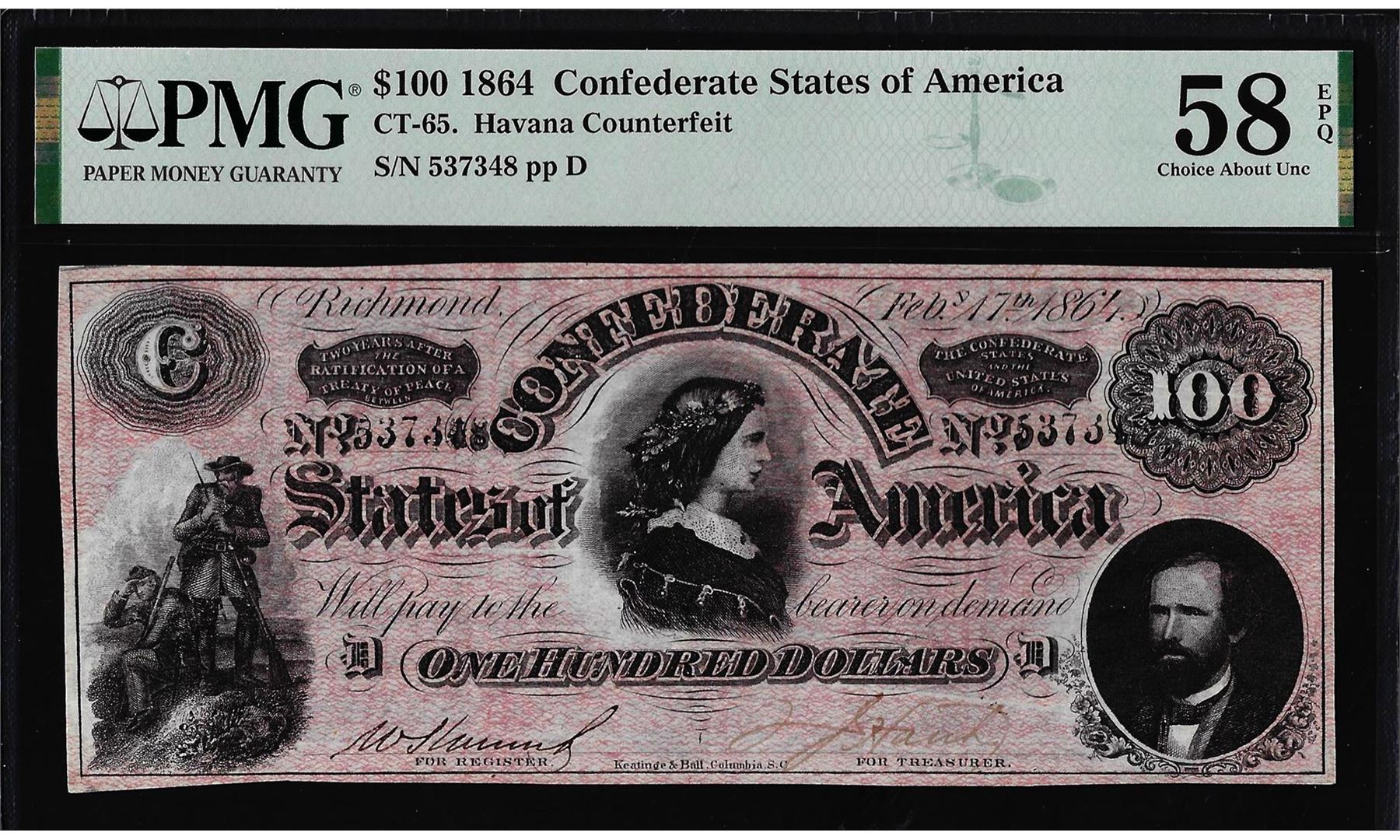 1864 $100 Confederate States of America Havana Counterfeit Note CT-65 PMG 58EPQ