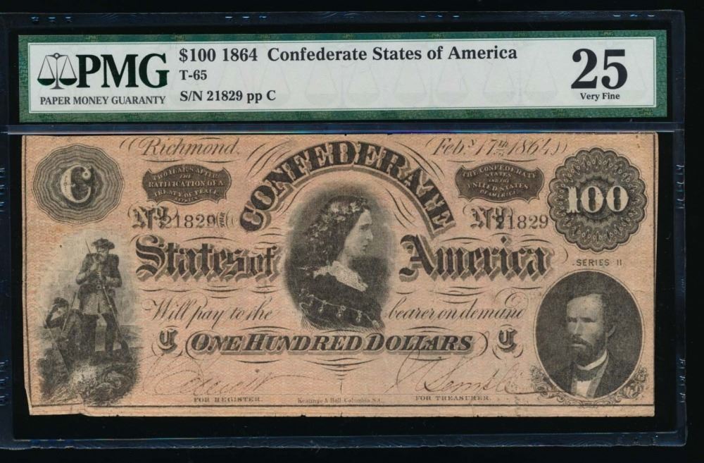 One 1864 $100 Confederate States of America Note PMG 25.