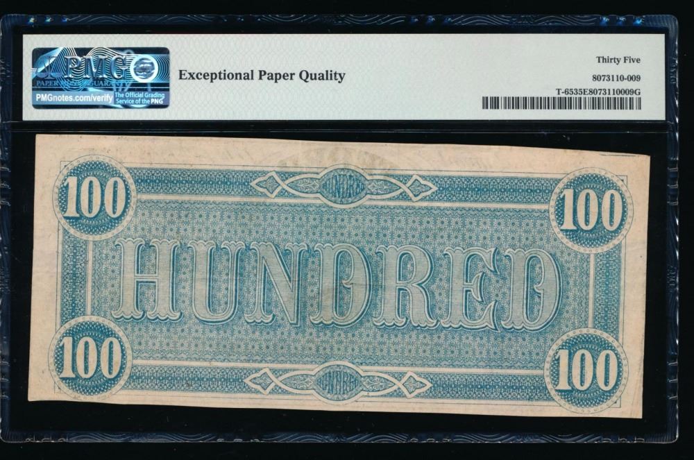 One 1864 $100 Confederate States of America Note PMG 35EPQ.