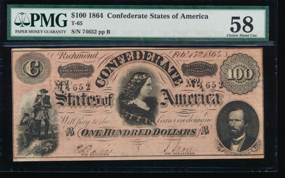 One 1864 $100 Confederate States of America Note PMG 58.