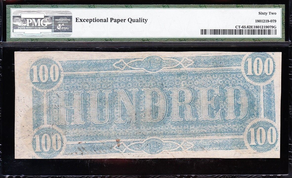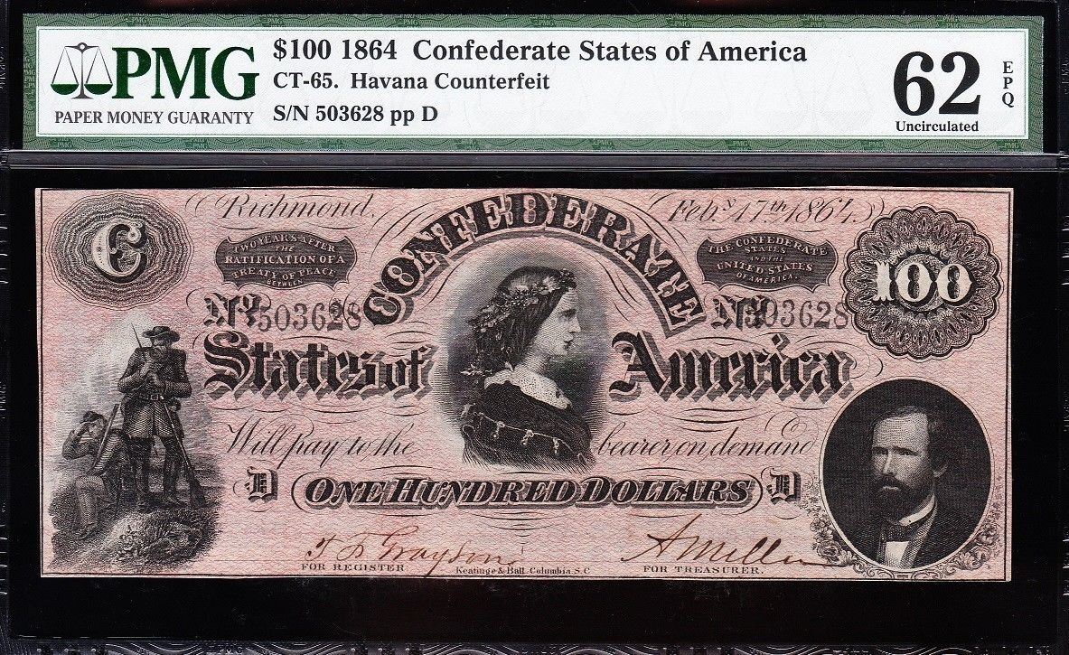 One 1864 $100 Confederate States of America Note PMG 62EPQ.