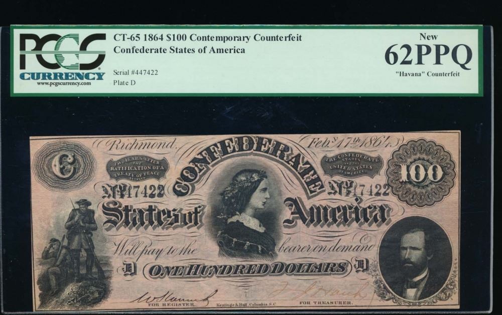 One 1864 $100 Confederate States of America Note PMG 62PPQ.