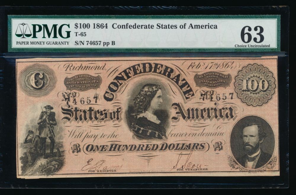 One 1864 $100 Confederate States of America Note PMG 63.
