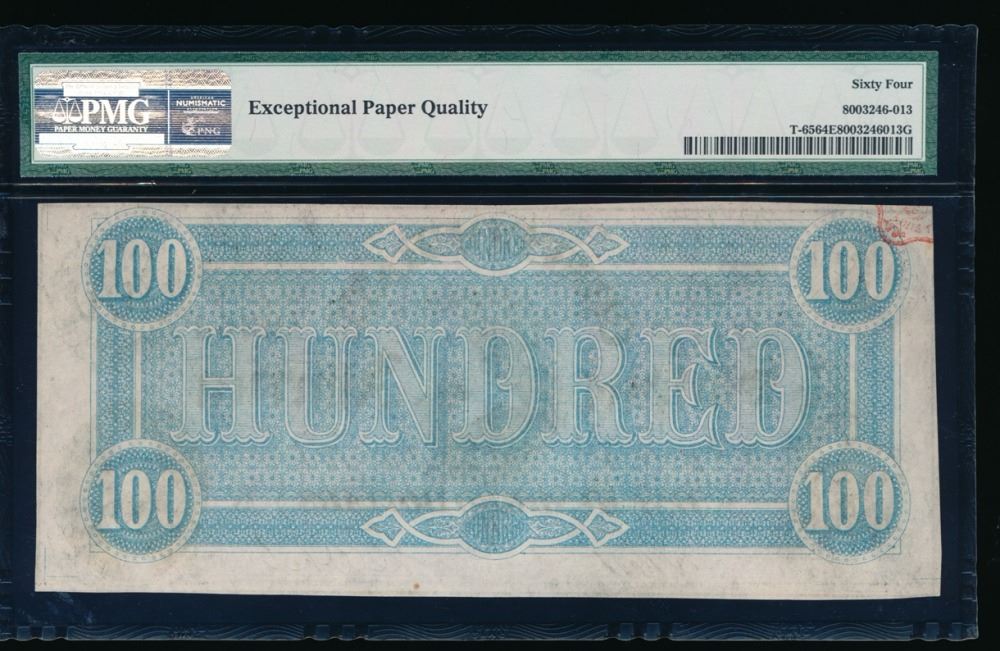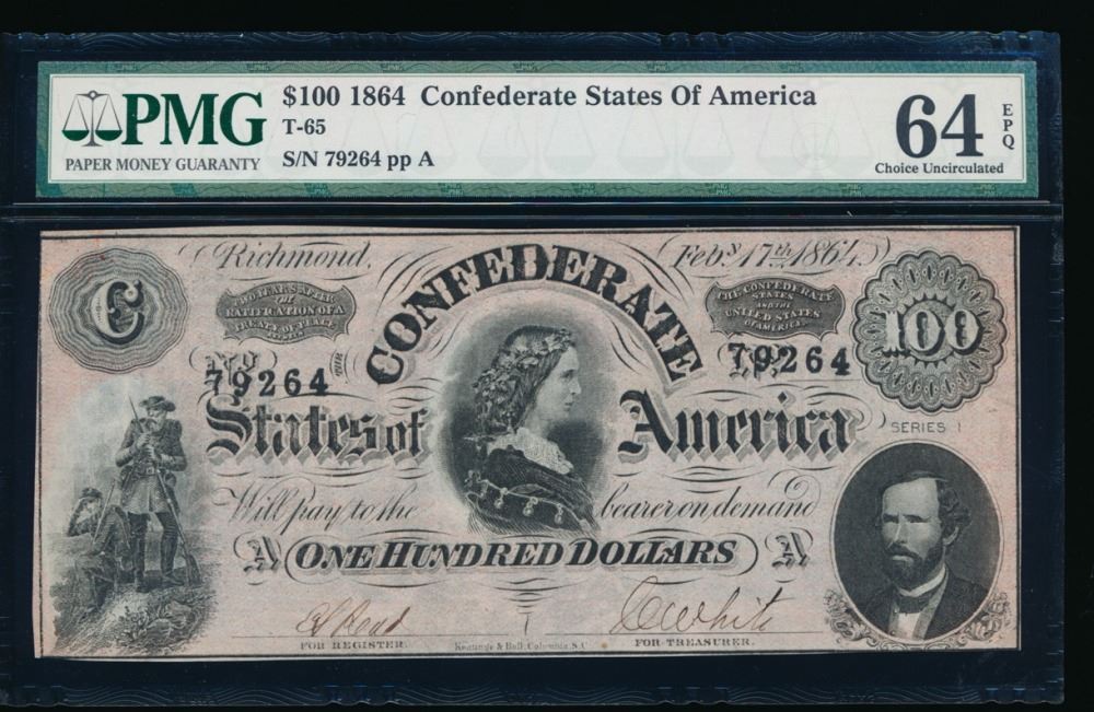 One 1864 $100 Confederate States of America Note PMG 64EPQ.