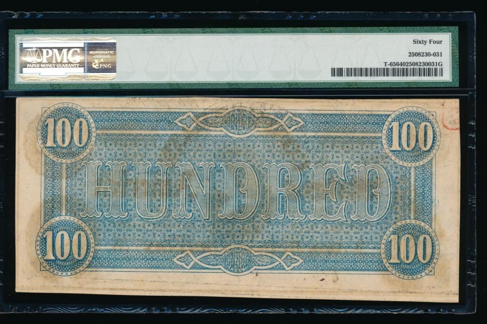 One 1864 $100 Confederate States of America Note PMG 64.