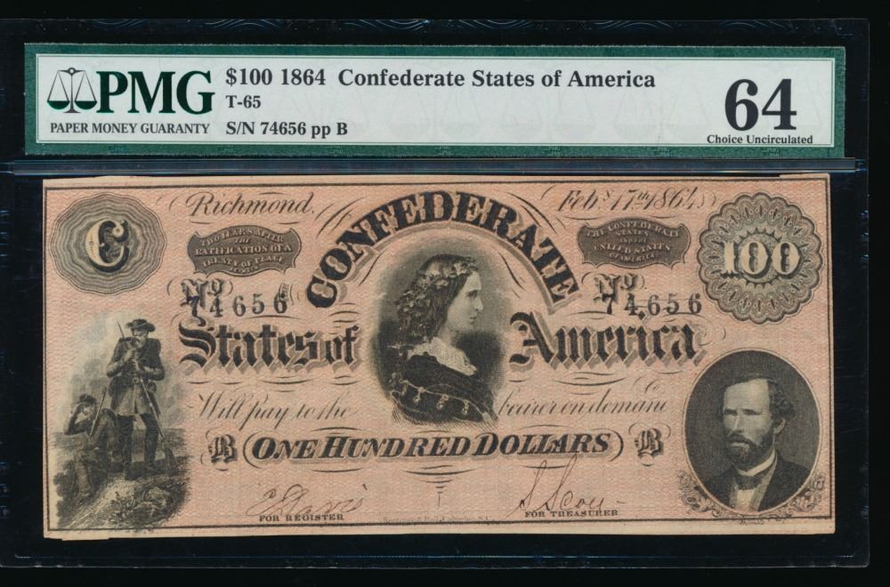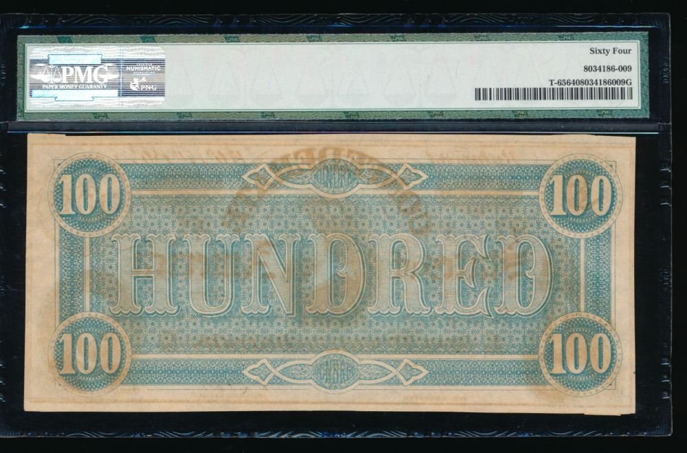 One 1864 $100 Confederate States of America Note PMG 64.